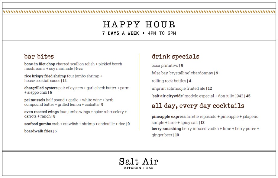 Nestled in downtown Rehoboth Beach, Salt Air offers a casually elegant dining experience, showcasing eclectic farm- and ocean-to-table cuisine. Our ever-evolving, locally inspired menu features the freshest seasonal produce, sustainable seafood, meats, and poultry. Unwind at our inviting bar with thoughtfully crafted cocktails and a curated wine selection. At Salt Air, we’re dedicated to delivering exceptional food, warm hospitality, and a relaxed yet refined atmosphere. Come experience the Salt Air difference.